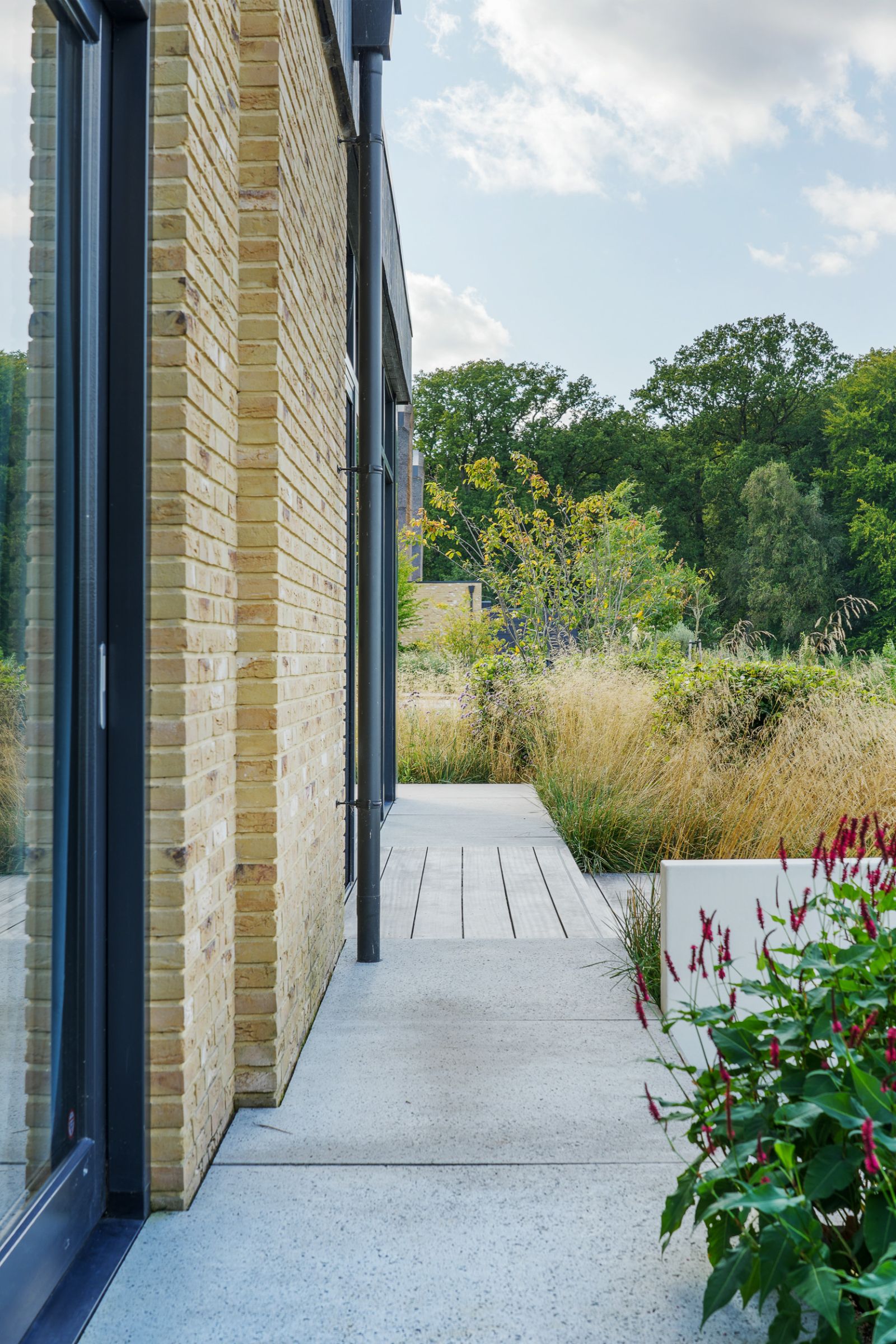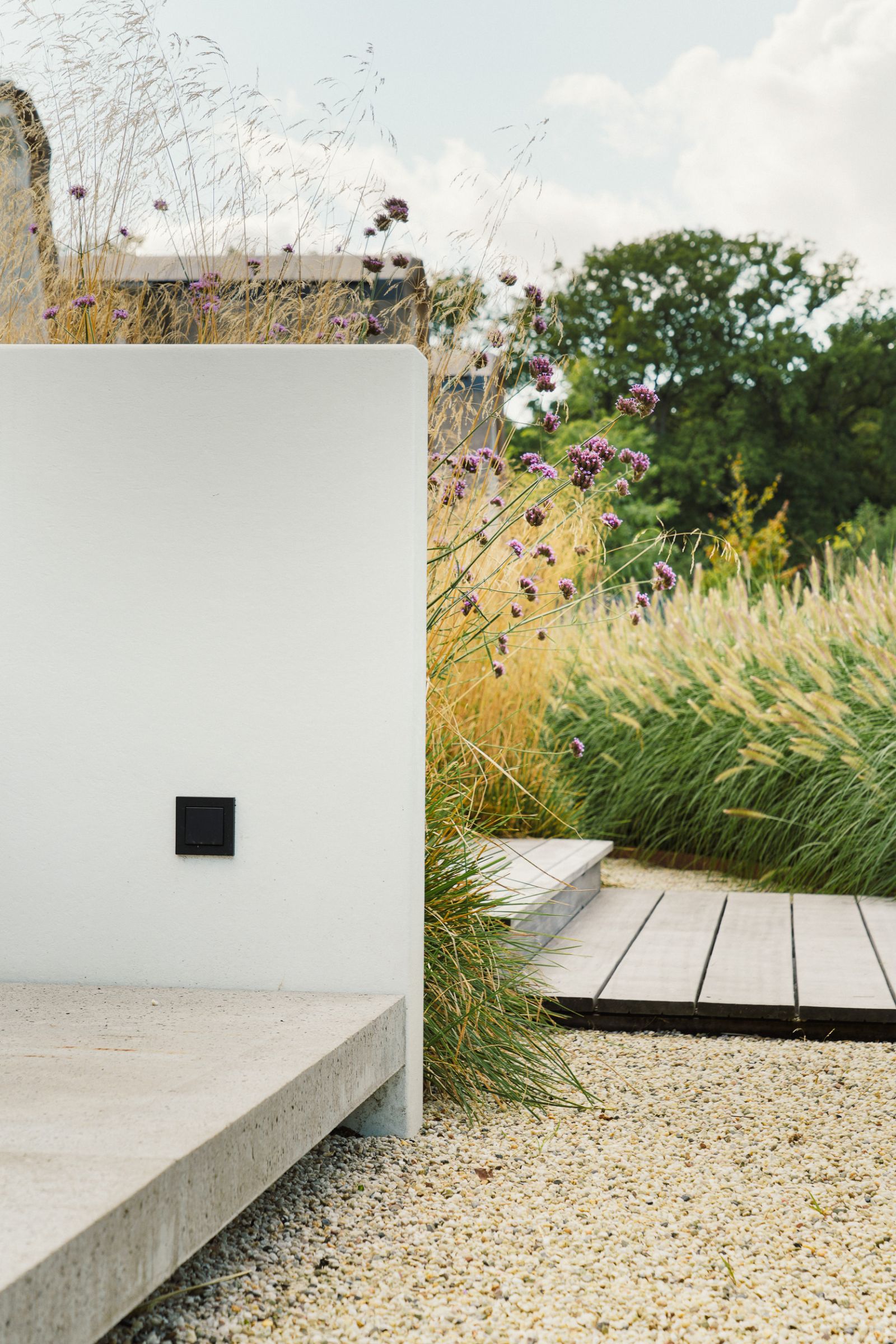 Hoogteverschillen en passende beplanting in de vorm van siergrassen en beukenwolken maken deze tuin af. En het schitterende uitzicht, door een dieptelijn vanaf het huis tot aan het water achter de tuin. Ook deze tuin is tot stand gekomen door een samenwerking tussen ZOË Tuinvormgeving en Van Leeuwen hoveniers.