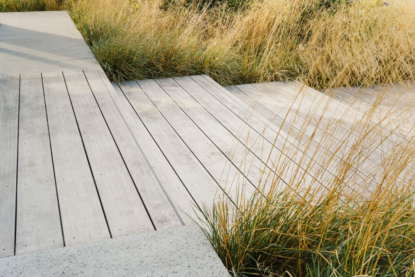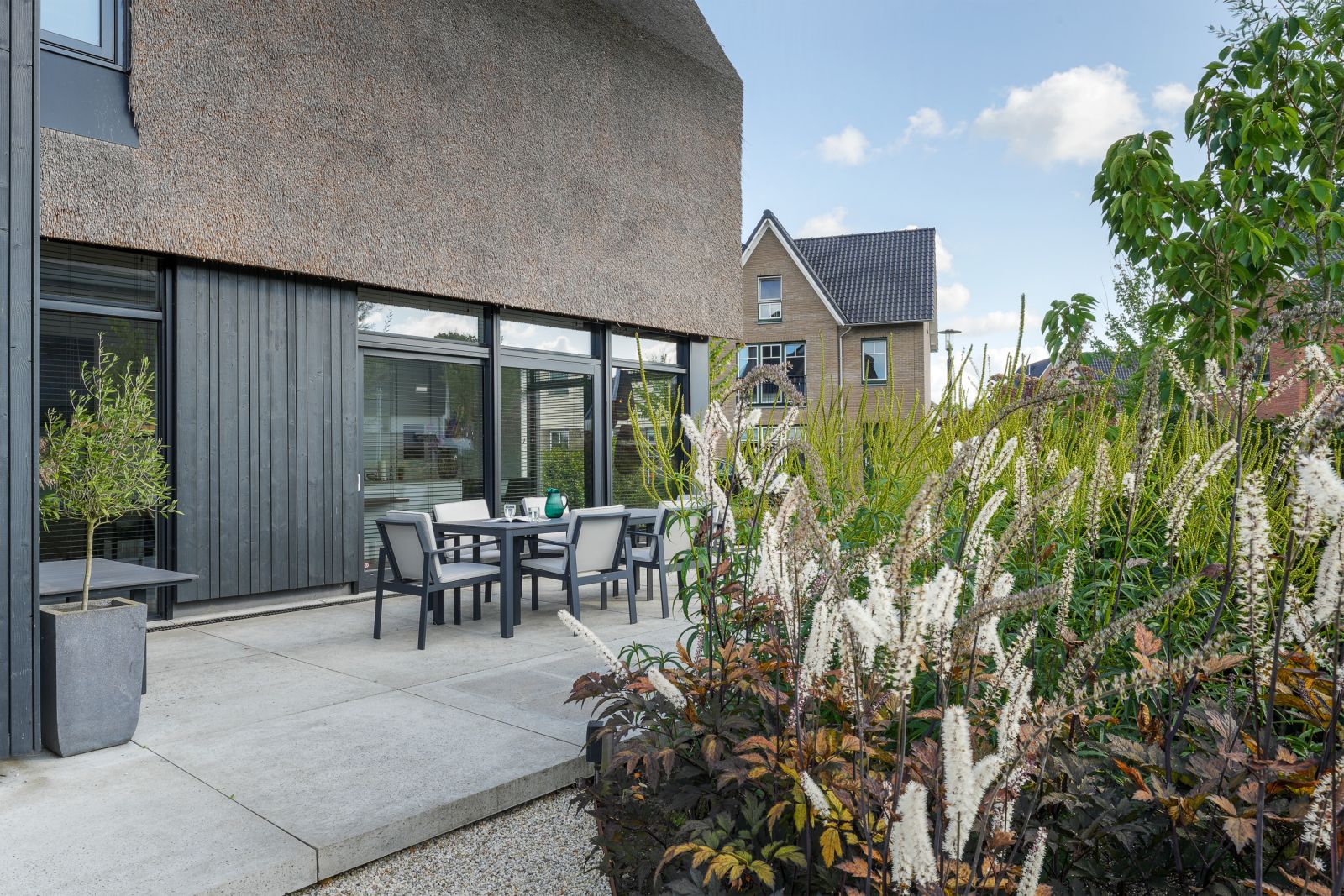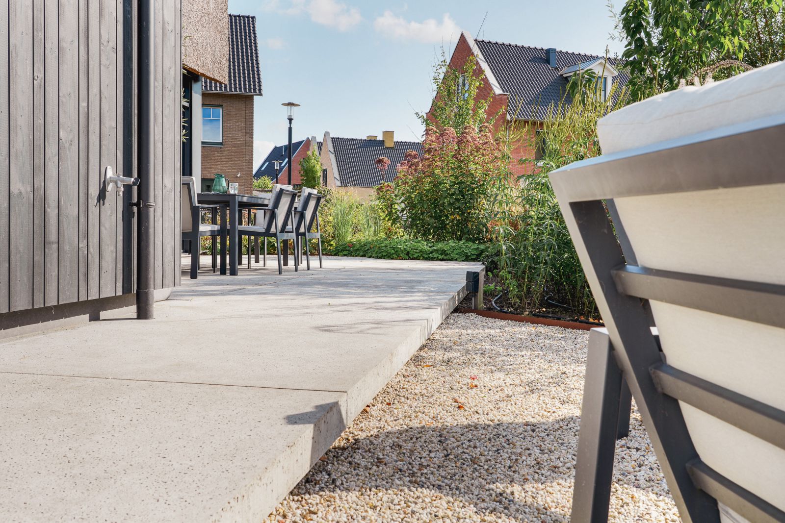 De zwevend geplaatste mega-tegels versterken de uitstraling van het huis én zijn een praktische oplossing om het hoogteverschil al deels op te vangen. Deze prachtige tuin ademt rust en ontspanning, met prachtige terrassen en zitkuilen aan verschillende kanten van de woning en dieper in de tuin.
